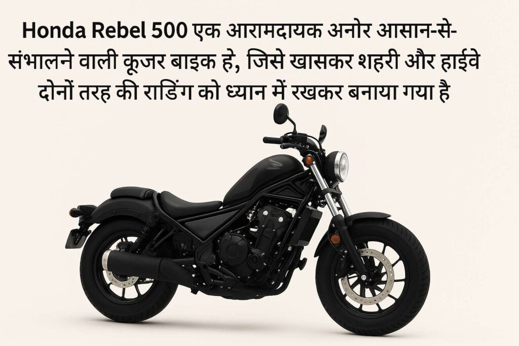 Honda Rebel 500 एक आरामदायक और आसान-से-संभालने वाली क्रूज़र बाइक है, जिसे खासकर शहरी और हाईवे दोनों तरह की राइडिंग को ध्यान में रखकर बनाया गया है। इसका डिजाइन मिनिमल लेकिन आकर्षक है। लो सीट हाइट, आगे की तरफ बढ़ा हुआ हैंडलबार और आरामदायक राइडिंग पोज़िशन इसे नए राइडर्स के लिए भी उपयुक्त बनाता है।